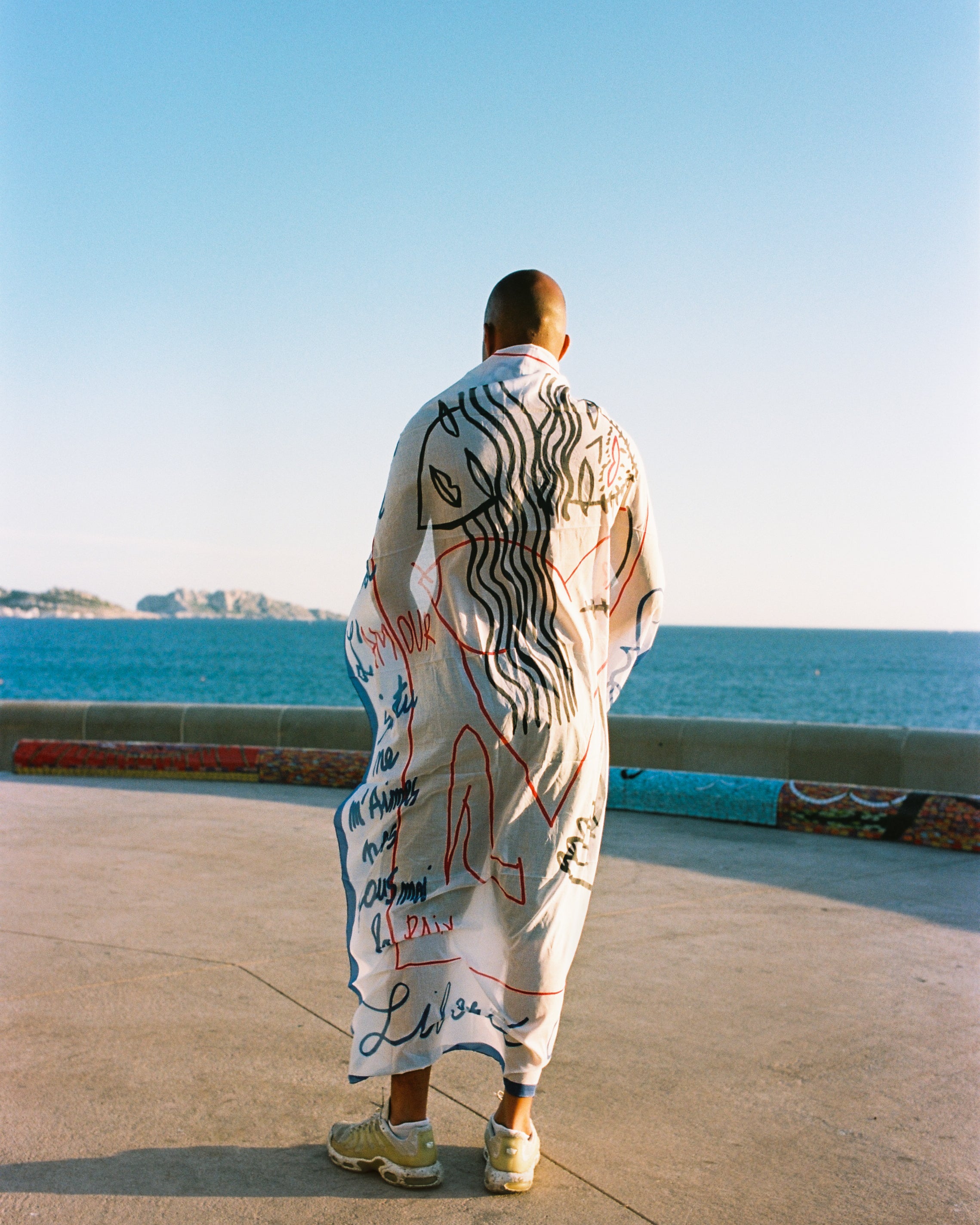 Dans de nombreuses régions du monde, les personnes trans font face à des niveaux alarmants de violence, de discriminations et d’exclusion. Accès aux soins entravé, rejet familial, précarité, absence de droits fondamentaux, politiques transphobes : les réalités trans sont marquées par l’invisibilisation et l’urgence. Cette marginalisation s'accompagne d’une exposition accrue au VIH, tandis que les structures de santé sont souvent inadaptées, voire hostiles, aux parcours trans. Intitulé "LibertéChéri.e", ce foulard manifeste un message fort: un plaidoyer pour l’amour, la paix, et la liberté d’être soi. Il incarne un cri poétique et visuel contre la stigmatisation, l’exclusion et la violence. Le dessin—sensuel, brut, et expressif—entrelace les corps et les cœurs, surmonté du message : "Si tu m’aimes donne-moi l’amour, si tu ne m’aimes pas,fous-moi la paix."